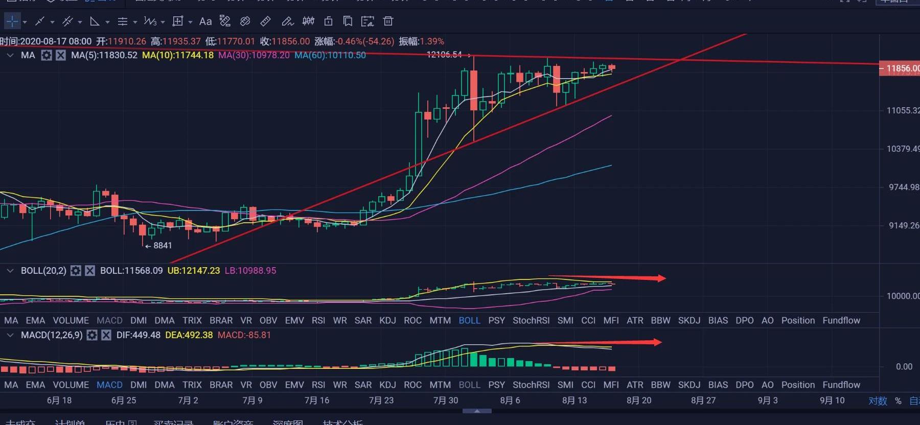 另外,根据AICoin指数行情显示,过去一周,灰度比特币信托持仓量增加了1.4万个,仅8月14日当天就增加了6295个。灰度不仅自己买比特币,还花巨资打广告让别人也都来买比特币。8月13日晚间,灰度首席执行官BarrySilbert在推特上公布的图片显示,金融服务及投资管理公司GalaxyDigital在《金融时报》上投放了比特币的巨幅广告。广告标语为:现在是投资比特币的时候了。而在此前8月7日,BarrySilbert宣布将在知名有线频道投放加密货币广告。在312之后正是灰度的不断购买比特币,才让比特币得以从4000美元下方开启反弹,6月份开始大致有1-2个月时间灰度没有再次买入比特币,比特币行情也一直持续在高位非常小的区间内震荡,而前段时间再次开始购买比特币,比特币价格也一举突破至12000美元。当前灰度资产买入比特币和比特币上涨之间的相关系是显而易见的,灰度的不断买入比特币以及长期以来对比特币的支持,对比特币当前的价格支撑甚至之后牛市的开启都起着至关重要的作用,至少我们知道只要灰度持续在买入比特币的时候,比特币的价格就不会出现大幅下跌,除非是灰度本身开始抛售比特币,但在目前看来,这种事情发生的概率显然非常小。行情方面变动并不大,白天一直处于回调中,回调的幅度不算大,主要还是在11800美元上方,既然是回调,就会有恢复涨势的机会,近些天普遍都是白天回调,晚上上涨,今天的行情走到当前位置,还是一如往常。日线图也比较明显,整体是在收缩三角形区间运行,而且当前正在靠近三角区间上轨,当前还是面临着突破的压力,当该上轨不仅是上轨,还是前期三次到该位置都被直接砸盘的位置,所以能保持当前的震荡结构已经是足够强势。