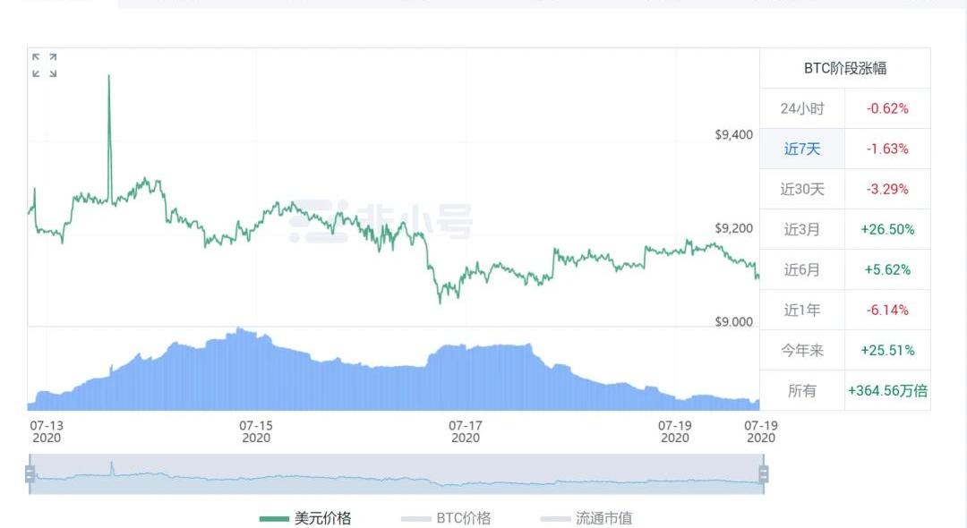 编者按:本文来自链内参,作者:内参君,Odaily星球日报经授权转载。过去七天来,比特币的价格在走势看涨的情况下走低,BTC周跌幅1.63%。ETH也是本周开始上涨然后走低,周跌幅为2.68%。数字货币市场又是震荡的一周。上周BTC进入了上升趋势,在7月8日飙升到9,470美元的高位。尽管需求增加,但9,470美元的阻力位却拒绝了比特币进一步上涨。这种拒绝引发了近几天的修正,BTC下跌了。到7月16日BTC的交易价格低至9,051美元。