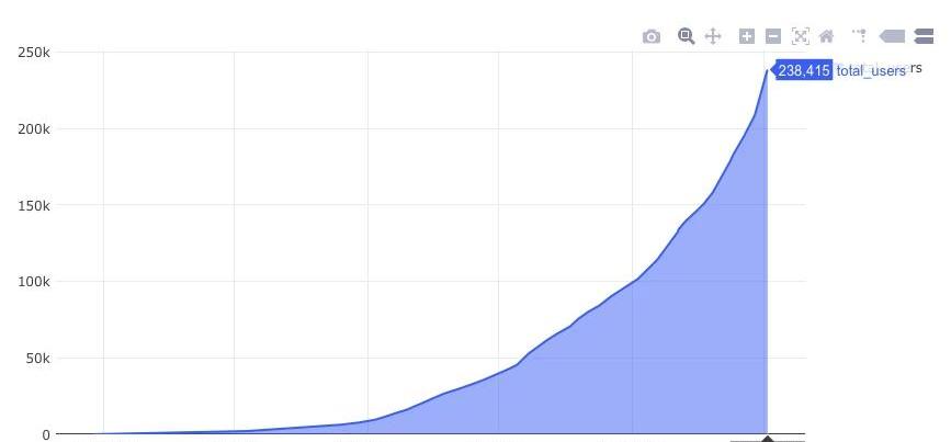 从市值上看,当前DeFi项目的总市值已经突破了74亿美元,锁仓的加密资产规模突破了20.8亿美元,呈现出井喷式的发展。可以说,DeFi已经成为了区块链行业里一股不容小觑的力量。我们再从用户增长数看目前的DeFi。根据DuneAnalytics统计,截至今年7月8日,DeFi的用户总数约为24万,而在2018年年初,这个数据还没破百。从下图中,我们也可以看到DeFi用户数量增长之快。
