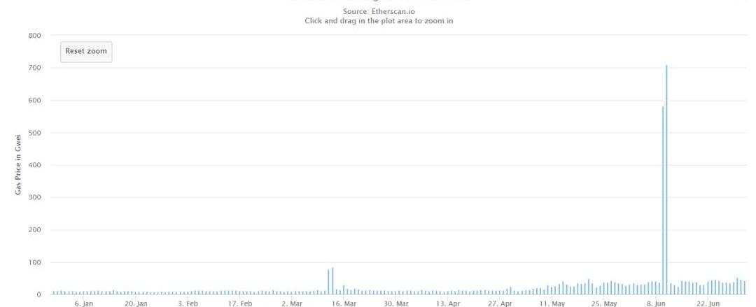 我们可以从目前的情况中学到什么?在以太坊上推出的DeFi项目越多,我们就越明白PoW可能会成为此类项目的障碍。在过去的一个月里,我们看到交易成本急剧上升,这是区块链行业的原生条件。随着用户及其交易量的增长,交易成本也在增长,这可能会大大减缓采用的速度。低价值的交易变得实在是太贵了。从下图可以看出,6月10日和11日就是异常昂贵的日子。