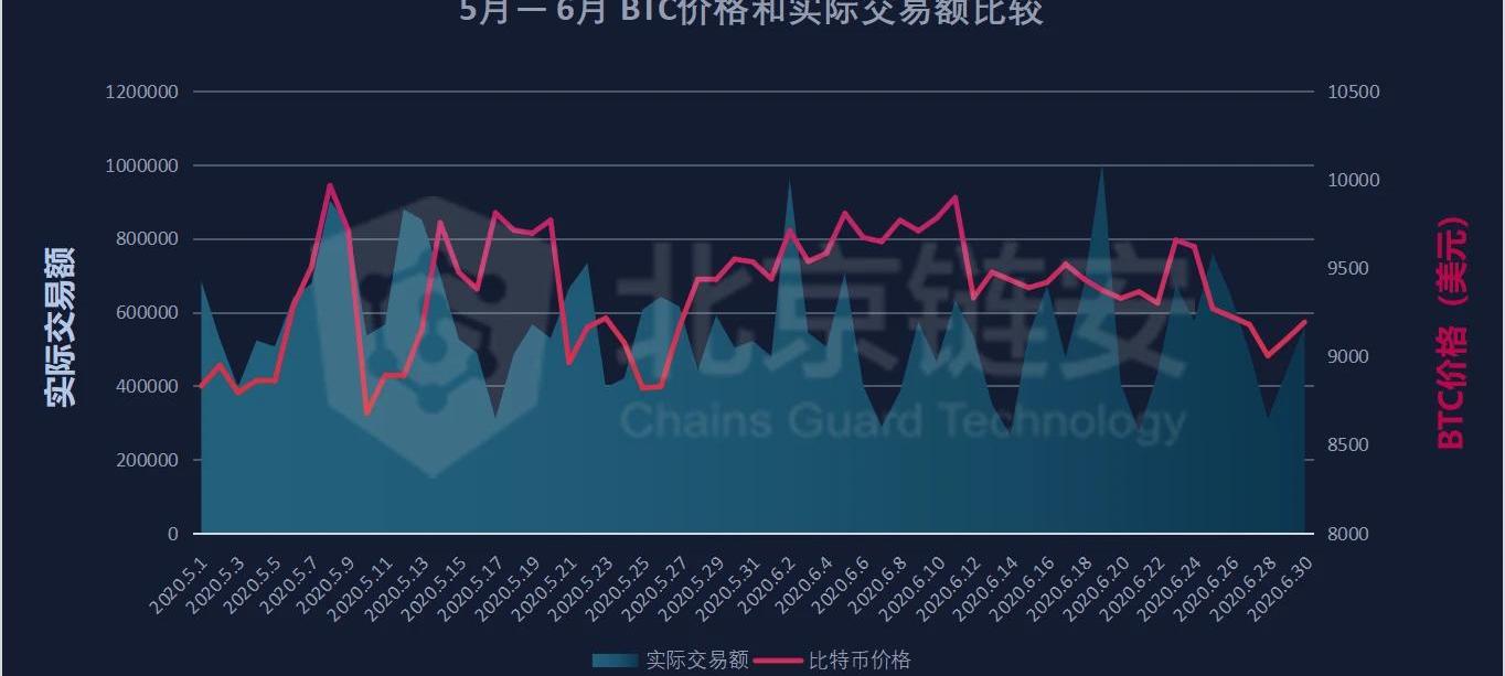 2020年6月,比特币链上实际交易额为16018034.22BTC,相较于2020年5月的18265959.46BTC下降12.31%。