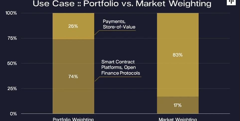 如果你认为,“但是,2017年的竞争币狂热不一样。这种事不会再发生了。”没错,可能不会。在过去的三年里,这个生态系统已经成熟了——市场已经开始区分优劣。我认为我们很难看到另一个实质性进展的代币项目通过ICO筹集数千万美元。这并不是说毫无意义的项目不会存在——还是会有,但与2017年相比只是一小部分。应用将集中在不可降级的价值存储和去中心化的金融。我们是比特币的主要支持者,我们相信一种非主权的数字货币是不可避免的。但是我们也关注那些使现实世界的金融用例成为可能的协议,并且相信与应用/支付代币相比,在长期的基础上这些资产将获得最大的价值。由于市场在2019年底左右开始上行,这比买入并持有比特币的策略表现得好。比特币不再是唯一。下面两个图表描述了相对于市场的比特币投资组合权重和基于用例的资产权重。