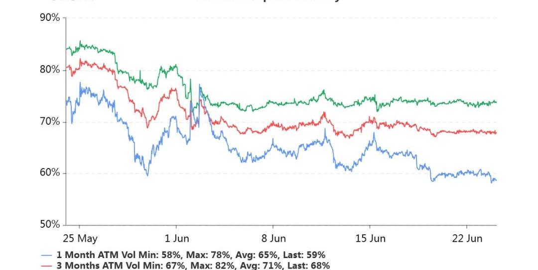 持仓量12亿美元,持仓量继续达到新高位置。交易量平稳。各标准化期限隐含波动率:今日:1m59%,3m68%,6m74%6/23:1m60%,3m68%,6m74%隐波保持平稳