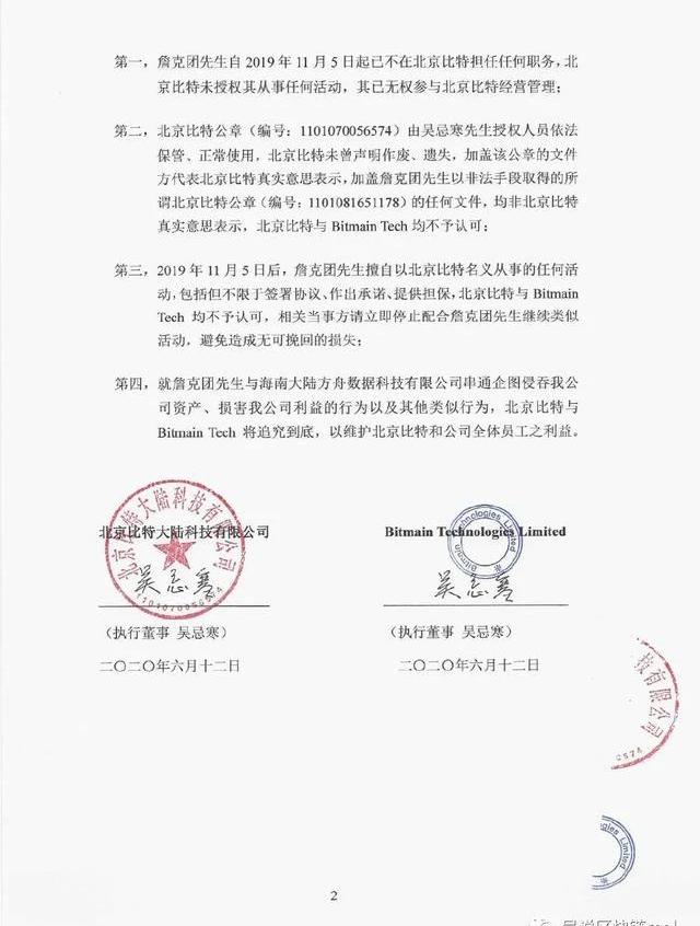 比特大陆昨天又发生了什么?在詹克团以扣留客户机器、要求员工回归上班发起激烈进攻后,吴忌寒展开了反击。在香港比特微博13日发布的声明中的关键点和唯一新意在于,吴忌寒指控詹克团与其持股的海南大陆方舟数据科技有限公司签署《销售代理协议》,企图侵吞北京比特资产,中饱私囊,表示将追究到底。天眼查数据显示,该公司注册于2018年11月22日,詹克团个人持股25%。詹克团在2019年8月2日成为其个人股东,届时吴忌寒尚未回归,詹克团仍然是比特大陆开曼、北京的董事长与法人。据星球日报2019年3月报道,该公司的起源是比特大陆正在开展“联合挖矿”业务,即合作公司提供电和矿场,比特大陆提供矿机,有矿工表述“詹老板出来做矿场了,在四川,16万负荷,10万台机位”;上述詹克团负责的矿场将运行蚂蚁矿机S11以及15型号。早期该公司股东并没有詹克团,而是北京比特大陆全资控股的福建创客科技有限公司,但在2019年8月2日福建创客换成了詹克团。