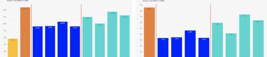 来源:CoinMetricsReferenceRatesCMBletchley(CMBI)指标见解在5月的最后一周,大多数CMBI和Bletchley指数弥补了前一周的损失,其中CMBI的ETH指数表现尤其出色。上周CMBI的ETH指数仅下跌了1%,再次表现最佳,本周回升了14.7%。所有Bletchley指数的回报率都在9%至11%之间,这表明了所有大型,中型和小型股资产的市场均势。
