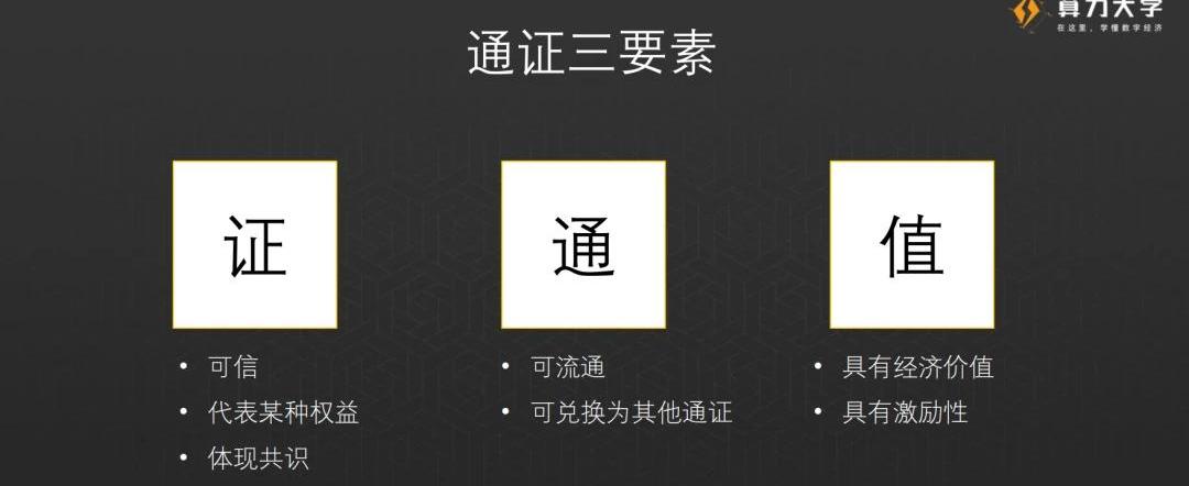 孟岩在课程中给出了通证的基本定义:通证是始终绑定身份信息的全局唯一、不可变的可编程数字对象,其包含三个要素:证、通、值。