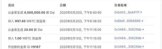 WBTC转入Nexo钱包地址,来源:Etherscan5月20日,Nexo通过Maker协议将此近1000枚WBTC进行抵押,用以产生400万枚Dai。而WBTC在本月初才由MakerDAO投票通过作为Dai新增的抵押品,两个事件发生时间点极为临近。