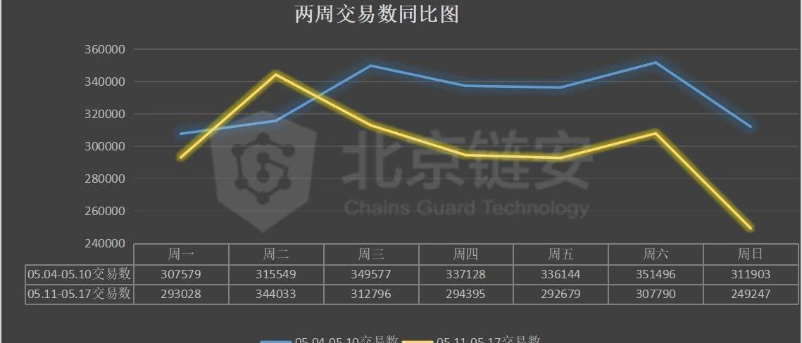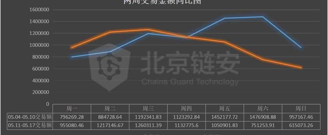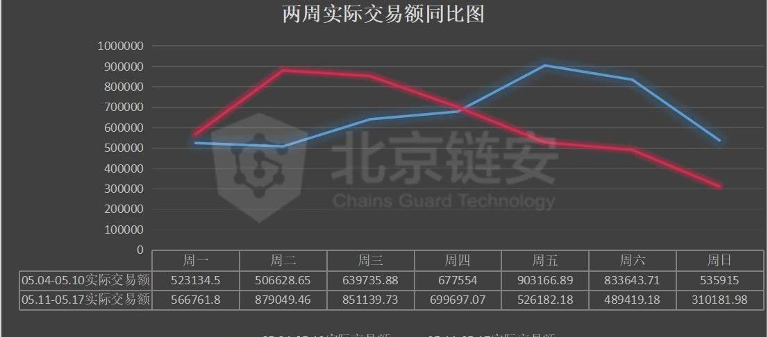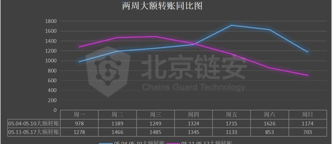 大额转账数:05.04-05.10:925505.11-05.17:8263较之前一周下降:10.72%详细数据图如下: