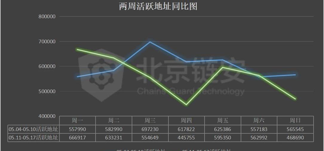 活跃地址数:05.04-05.10:420414605.11-05.17:3927584较之前一周下降:6.58%详细数据图如下: