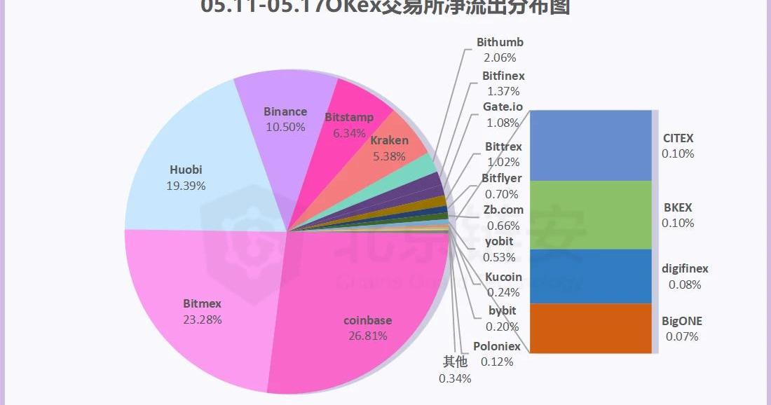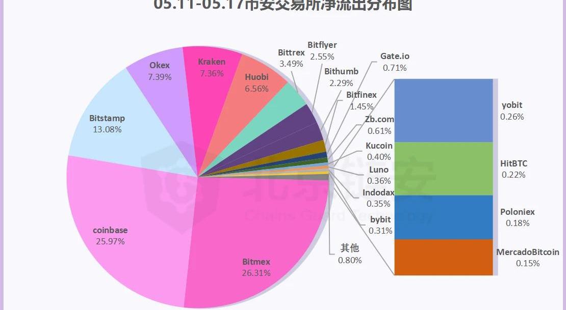 可以看到,作为国际用户分布更加广泛的币安,和coinbase、Bitmex这样的海外交易所关联程度更高,而火币流出的比特币中,在过去一周大部分流向了币安。注:以上比例根据各交易所流出到已确定主体地址中的分布计算,排除了未确定主体的地址和独立地址,即在交易所流出的所有比特币中,相关主体的实际占比会更小一些。安全和数据要闻方面:Upbit被盗ETH开启新一轮过程,超2万ETH涉及北京链安Chainsmap监测系统5月14日发现,近24小时,Upbit被盗ETH开启了近期第二轮过程,已经有23622ETH进入流程,清空了3个Upbit被盗ETH相关的剩余核心存币地址。此前,在北京时间5月6日到7日,距Upbit被盗ETH上一次过程超百天后启动的过程中,近4万ETH进入过程,清空6个Upbit被盗ETH相关剩余核心存币地址。至此,Upbit相关核心存币地址尚存4个未被清空,剩余的尚未进入流程的ETH仅剩36000余枚,从目前来看,相关ETH大都会拆分后汇聚到核心地址分发进而进入交易所,我们也发现有个别交易所的地址多次参与接收相关涉事ETH。据悉,在Upbit被盗后,相关司法部门也已经介入,在业界配合和司法措施下,部分ETH已经在相关交易所被冻结。