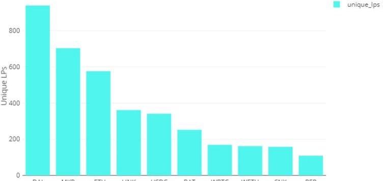 DAI市场目前拥有最多的LP。然而,奇怪的是,USDC只有342个LP。尽管REP支持超过550万美元的流动资金池,但它仍然拥有109个LP。