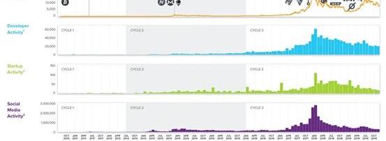 第二个周期在2013年末达到顶峰,可能大多数科技行业以外的人也是在这时开始听说比特币的。在该周期中,大约有10倍的开发人员和初创企业进入这个领域。也正是在这个时候,很多重要的项目得以建立和融资,特别是以太坊,它也在一定程度上引发了2017年第三个周期的热潮。加密周期的一个关键特征就是,每一个周期都播种下一颗种子,随着种子的生长会推动下一个周期生成。