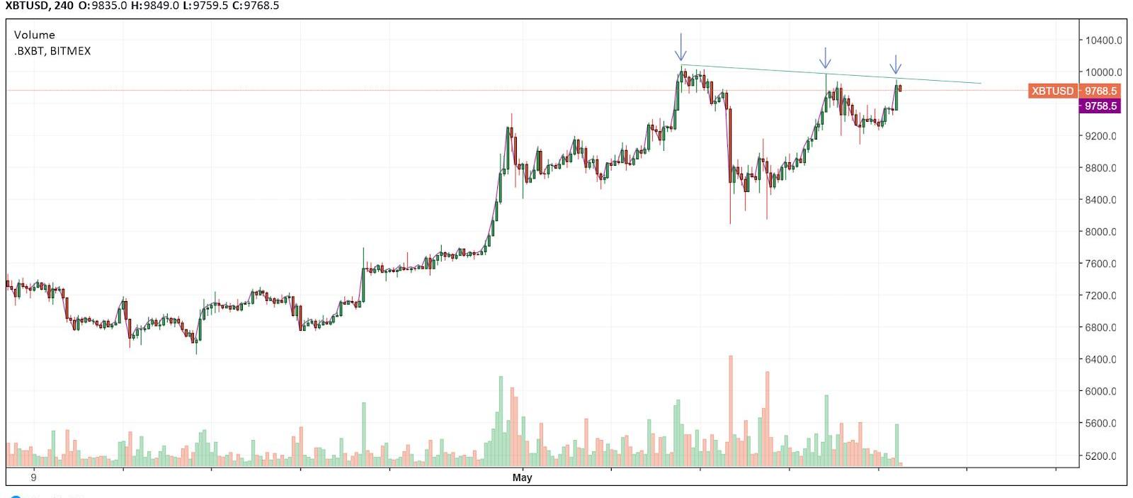 4H比特币价格图表上的三次低高点来源:TradingView5月8日,比特币价格一度涨至10,085美元,但未能维持在10,000美元上方,最终跌至8,100美元。5月14日,比特币飙升至9,970美元,但遭到大幅回调,跌至9,100美元。今天,比特币三次触及9,910美元,但未能突破上方阻力位。三个低高点(由三个连续的较低峰值组成)增加了比特币在短期内将经历大幅回调的可能性。