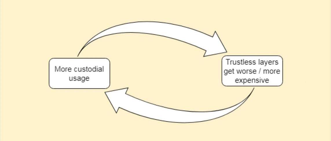 人们之所以使用更高的层,是因为它们在信任/成本范围内为他们提供了更多优势。请记住,“成本”包括很多东西,不仅仅是交易费用,它还包括网络效应、结算时间、可逆性、隐私等。笔者担心会存在一个反馈回路,使托管层变得越大越有吸引力,从而吸引更多的用户使用它们。首先可以用金本位的例子来说明这一点。每个黄金使用者都在与市场上的其他使用者竞争。如果他们可以早日偿还债务,则供应商更愿意与他们开展业务。如果银行可以给他们更低的费用,他们就可以将节省的价格转给贸易伙伴。结果是形成反馈循环,随着时间的流逝,用户迁移到最便宜的解决方案上。使用银行帐本的好处在于局部区域性和即时的服务,而不利的方面则在于全球性,经常会拖延很久。比特币中存在相同的反馈循环,但是可以说以更强大的方式存在。如果托管银行层变得非常成功,想象一下,所有的这些结算交易会提高基础层的交易费用。突然之间,越来越多的人因为交易费大幅上涨而完全无法使用无需信任层。保管机构有能力为基础层空间支付更多的费用,因为他们的交易代表了成千上万链下用户的捆绑利益。