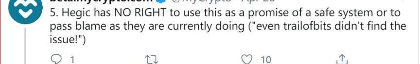 5Hegic无权利用这份审计报告宣称自己是个安全的系统,或者像当前这样转嫁责任「甚至trailofbits都没有发现问题!」