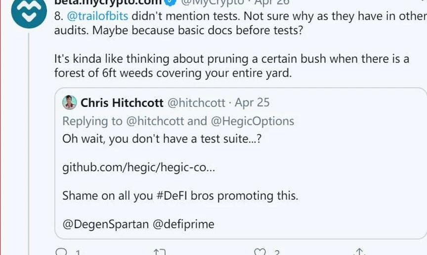 8@trailofbits没有提到测试。不确定他们为什么在其他审计中有测试。也许是因为在测试前的基本文档就有问题?有点像如果我的院子里长满了6英尺高的野草,我就去考虑修剪更高的灌木问题。