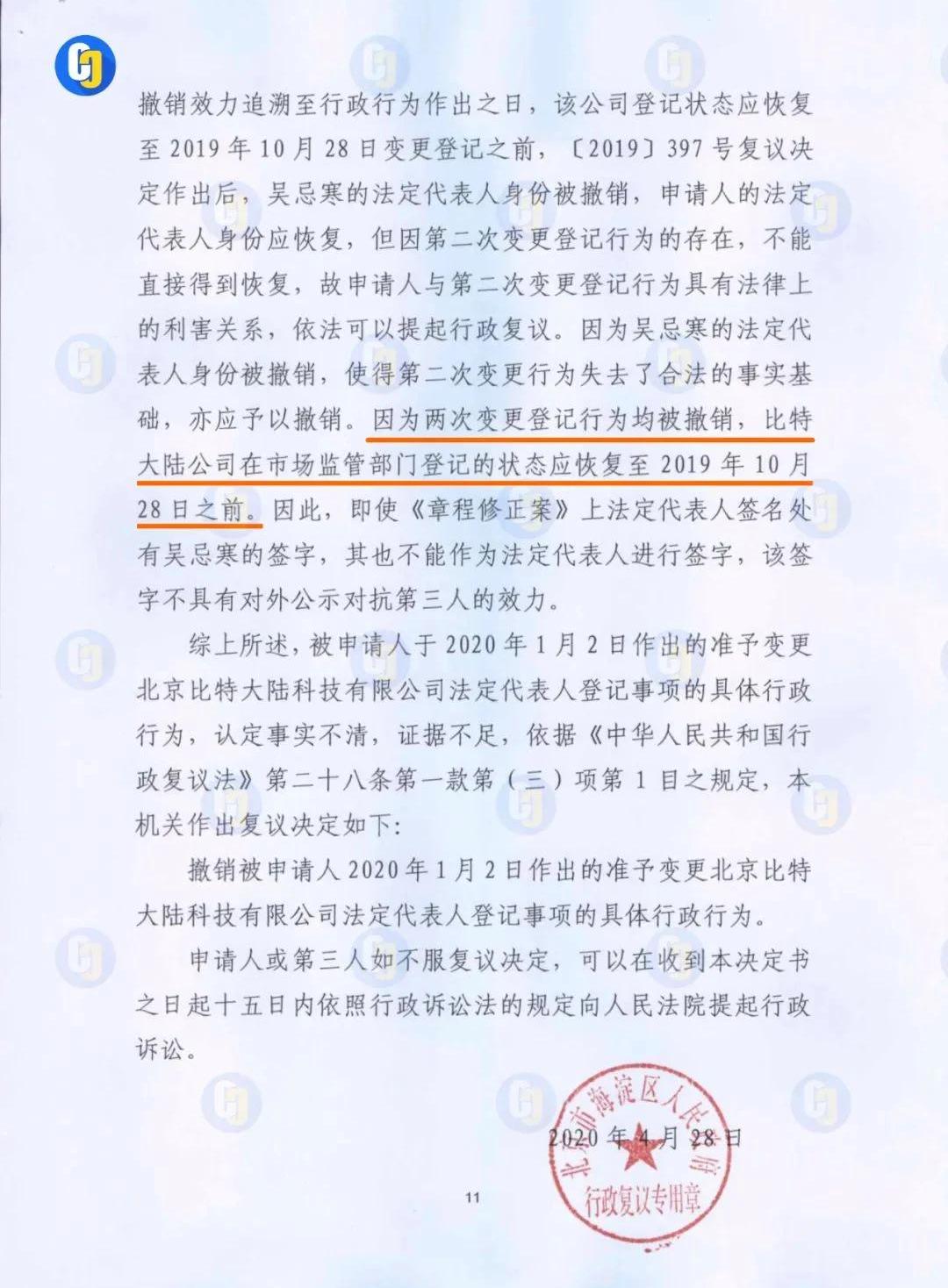 北京市海淀区人民政府行政决议书显示,2019年11月7日,申请人詹克团不服被申请人北京市海淀区市场监督管理局于2019年10月28日作出的变更登记行为,向海淀区人民政府申请行政复议,要求撤销被申请人作出的准予变更北京比特法定代表人、执行董事登记事项的行政行为。397号决议书显示,2019年10月28日,北京比特向海淀区市场监管局提交了外商投资企业变更登记申请书等材料,申请对北京比特的法定代表人进行变更登记,对公司董事、经理、监事事项进行变更备案。当日,海淀区市场监管局即准予了北京比特变更登记备案。此次变更的主要依据为2019年10月28日北京比特的《股东决定》。复议决议书显示,经海淀区人民政府查明,本案中,《股东决定》作为对企业法定代表人任免的文件,系本次法定代表人变更登记行为中的重要证据。北京比特大陆擅自将《股东决定》中第5项“同意修改公司章程”划去并加盖公章的行为,属于对《股东决定》的无权修改,破坏了该《股东决定》的真实性。本案第三人,即北京比特及吴忌寒主张,《股东决定》上针对章程的修改并不对本次变更登记行为产生实质影响,只是进一步确认此次变更登记行为的申请事项。海淀区人民政府查明,《股东决定》并未明确写明变更法人,法人变更登记的主要依据是北京比特在2018年11月备案的公司章程中,第二十一条规定,执行董事为公司的法定代表人。因此,《股东决定》中被划去部分“同意修改公司章程”直接影响法定代表人变更登记行为。第三人多次提交的书面意见对《股东决定》是否要求修改章程一事实始终论述不清,前后矛盾。而被申请人在变更登记过程中,发现《股东决定》被修改,应要求北京比特对此核实确认,而不应当场作出准予变更法定代表人登记行为,属于认定事实不清、证据不足。本案中,被申请人在行政程序中未尽到审慎审查义务,错误作出登记行为。决议书提到,除非有充分证据证明划去“同意修改公司章程”系股东做出《股东决定》当时的真实意思表示,否则复议机关并不能对此次登记行为予以认可。