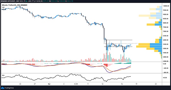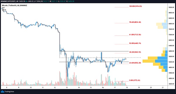 截至发稿时,比特币继续在5050美元至5400美元的区间内波动,在5500美元位置遇到阻力。1小时和4小时的时间框架显示了一个更高低点的走势,一个积极的信号是比特币似乎即将把5400美元的位置变成支撑位。