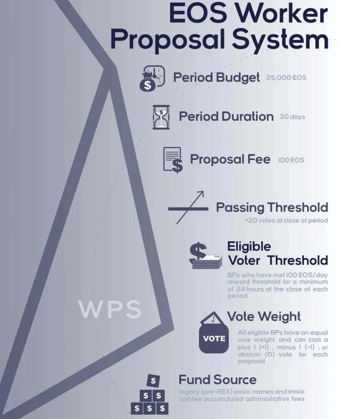 1、提出提案任何EOS账号都可以向WPS系统提交提案,为了防止垃圾邮件,正式发布提案必须向eosio.wps支付100EOS,这100EOS的费用会流入eosio.wps账号,然后将重新分配给通过的提案。提案中要写清楚提案名称、项目时间表、提案详细说明以及提案预算等信息,这就像写创业计划书,需要让投资者看的,写WPS提案是要给合格投票者投票用的,这些合格投票者可以对提案发起投票。2、合格投票者投票在给提案进行投票时,只有合格投票者才有资格投票,什么是合格投票者呢?合格投票者就是在过去24小时内在EOS主网上达到奖励阈值100EOS/天,据bloks统计,符合合格投票者标准的节点大概有60多个。关于合格投票者的标准以及投票权重,都内置在WPS智能合约中,只有在21个超级节点中至少有15个节点同意才能进行调整。在投票时,所有合格投票者都拥有相同的投票权重,并且可以给每个提案投赞成(+1)、反对(-1)或弃权(0)票。提案的投票期限是30天,当然,只要超级节点中有15个节点同意就可以修改投票期限。3、提案通过要通过提案,必须满足以下条件:1)至少需要20票净赞成票;2)所有通过提案的累计预算不得超过投票期的总预算,如果所有满足投票阈值提案的累计预算,超过了投票期现有预算,则在投票期总预算最大值到来之前,通过阈值的提案应按照排名顺序来获得资金奖励。第2个条件容易理解,我们重点说说第一个条件。我们在前面提到过,每个合格投票者都可以投赞成(+1)、反对(-1)或弃权(0)票,那么,一个提案最终的净赞成票是这样计算的:净造成票=支持票总数x+反对票总数x+弃权票总数x根据提案通过的标准,一个提案要想通过,至少得有20个合格投票者参与投票,而且还必须都得是赞成票才行。20个合格投票者基本上占了合格投票者的三分之一,即至少得有三分之一以上的合格投票者参与WPS投票,WPS提案投票所覆盖的范围相对还是比较广的。