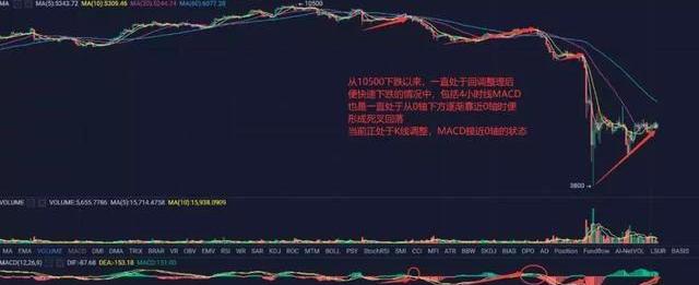 而且,非主流货币看一时的涨幅参考意义并不大,操控性的概率比较大,即使目前涨幅过高,若是主流货币走势不理想依然是徒做无用之功。大家什么时候见过在BTC低迷的状态下,其他币种能够维持长时间健康上涨?所以,试图追涨的小伙伴切记要量力而行。目前整体大环境依然是比较悲观的状态,昨晚美股再次熔断,其实大家已经看得有些审美疲劳,但还是需要警惕当前情况的严重性,现在并不是市场最恶劣的时候。若是接下来情况未发生好转,才会出现真正的金融危机,包括银行倒闭,投资公司爆仓,国际大公司破产等情况都有可能发生,届时无论是投资环境还是个人生活都会受到较大影响。再回到行情上,目前整体价格依然围绕着5300附近震荡,且整体震荡区间有所缩小,投资者的矛盾在于是否处于企稳的过程,实际上这一点并不重要,在下跌过程中,特别是短期内的快速下跌行情中,整理企稳之后并不意味着一定是向上涨,更大的概率是处于下跌中继的企稳,整理后继续下挫。从10500持续下跌的过程可以看到,下跌—回调整理—持续更深的下跌已经成为常态,下图特别指出MACD是因为当前4小时MACD已经接近0轴,按照前面的走势规律可能再度形成死叉,这是我们必须考虑的风险因素。