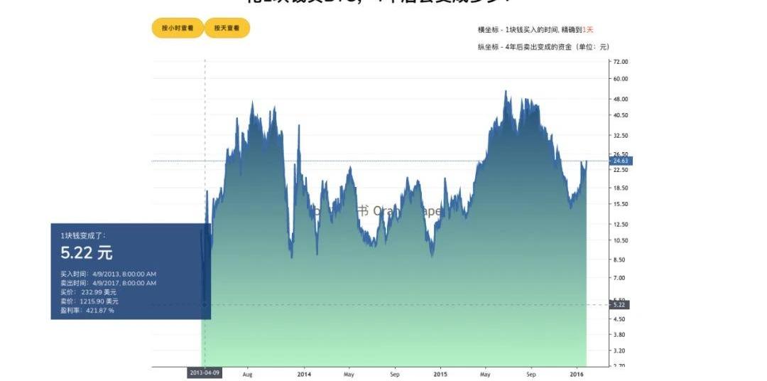 上面是任意一个小时内买入、然后4年后卖出的盈利情况,数据按照盈利率从高到低的顺序排序。这里的盈利率=可以看到:历史最高收益:5583.53%,2015年6月27日凌晨3点以241.54美元价格买入,4年后以13728美元价格卖出。历史最低收益:366%,2013年4月10日晚上8点以262.1美元价格买入,4年后以1222.8美元价格卖出。如果不放4年呢?看看其他时间长度的表现:2年-最高:4244.85%,最低:-68.38%-下载3.5年-最高:7558.6%,最低:-36.99%-下载5年-最高:14405.63%,最低:241.84%-下载6年-最高:18035.48%,最低:533.59%-下载结论:放着小于4年有可能出现亏损,而持有4年后再卖出,则都是赚钱的。