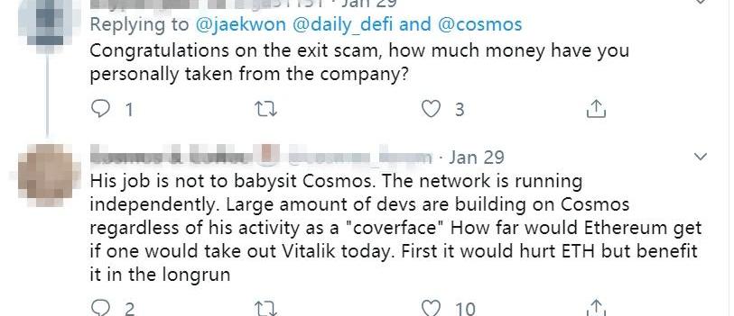 JaeKwon宣布离开后,社交媒体上关于此事的两极化态度截图来源:推特随后,Tendermint官方也在推特上解释了此次高层变动,表示JaeKwon也会继续担任基金会理事成员。而在自己的另一个推特账号「@jaesustein」里,JaeKwon也给出了这次「出走」的更确切说法,他澄清:「当你听到我要『离开Cosmos』的谣言时,很可能就来自那些试图操纵市场,或者你的人。」