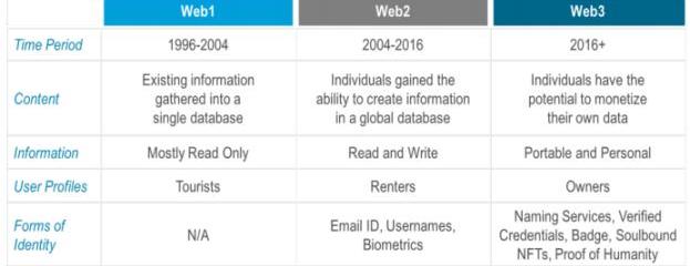 Web3的数字身份是指个人或实体在区块链上的唯一、可验证和去中心化的身份表示,即以数字方式证明「我是谁」。Web3数字身份解决方案旨在为个人和实体提供对其数据的掌控,以及以安全和可信的方式使用这些数据的能力。我们从Web1数字身份的简单电子邮件范式,发展到Web2时代唯一更安全、更孤立的数字身份形式。现在,我们正处于Web3时代的风口浪尖——去中心化链上自我主权身份。这能够允许用户拥有自己的身份,从而拥有自身的数字内容和数字资产。