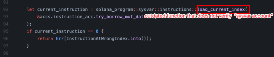这个漏洞的根本原因是在验证签名过程(“verify_signatures”)中,程序使用了一个在Solana更新至1.8.0时即被废弃的“load_current_index”函数。该函数不会验证输入的“sysvar account”是否真的是“system sysvar”,从而攻击者可以趁机伪造这个关键帐户。