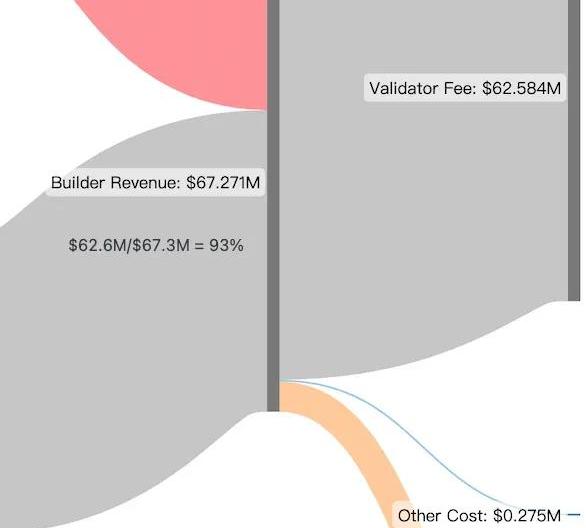 值得注意的是,搜索者和其他用户支付的一部分Gas费将以基础费用的形式被销毁,而普通交易支付的基础费用未在图表中列出。然而,尽管构建者的收入达到了惊人的6730万美元,但其中93%被用于竞标中继拍卖以补偿验证者,确保验证者最终提出区块。因此,这两个月构建者的明确收入仅为440万美元。而验证者在2023年前两个月最终获得了6260万美元。