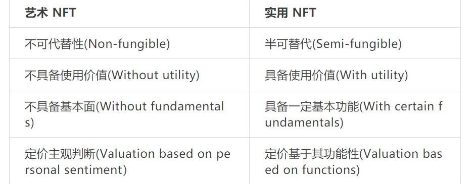 在了解NFTFi之前,让我们回归NFT概念。NFT是Non-FungibleTokens,不可替代性是其根本属性。为了便于理解NFT的金融化,首先将NFT分为两类,一是具备收藏价值的纯粹艺术NFT;二是具备特殊的使用价值的实用NFT。
