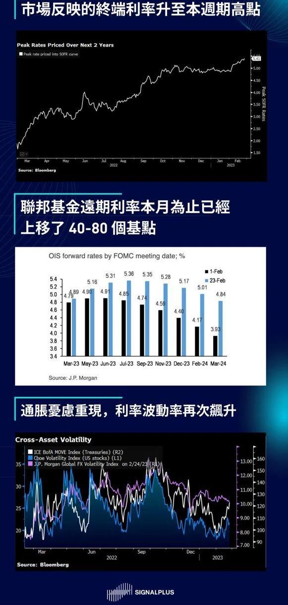 不出所料,更强劲的通胀数据再次推升利率市场,远期终端利率突破5.4%的周期高点,2024年1月联邦基金利率上周收在5.30%,甚至高于美联储自己的中值5.125%,3月加息50个基点的机率预测也已从一周前的<10%升到目前的30%左右。经过与美联储的长期斗争并“得逞”之后,利率市场又重新回到了“利率升至更高维持更长时间”的原点,利率波动性也回升至12月的水平。