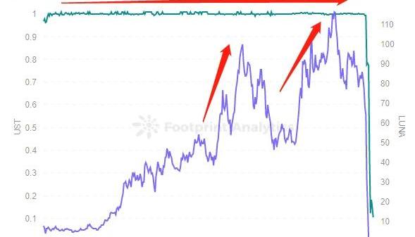 UST币价稳定于1美元FootprintAnalytics数据显示,自2021年5月27日到2022年5月8日期间,UST长达约1年的时间,稳定在1美元左右的价格。并且LUNA的价格也出现2次的大涨,最高时达到116.32美元。