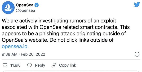 Opensea在推特上承认了这一漏洞,并表示这一漏洞似乎是一种网络钓鱼攻击,它导致一些用户在攻击者那里签署了一个恶意负载,从而使攻击者有权从用户的钱包中窃取 NFT。