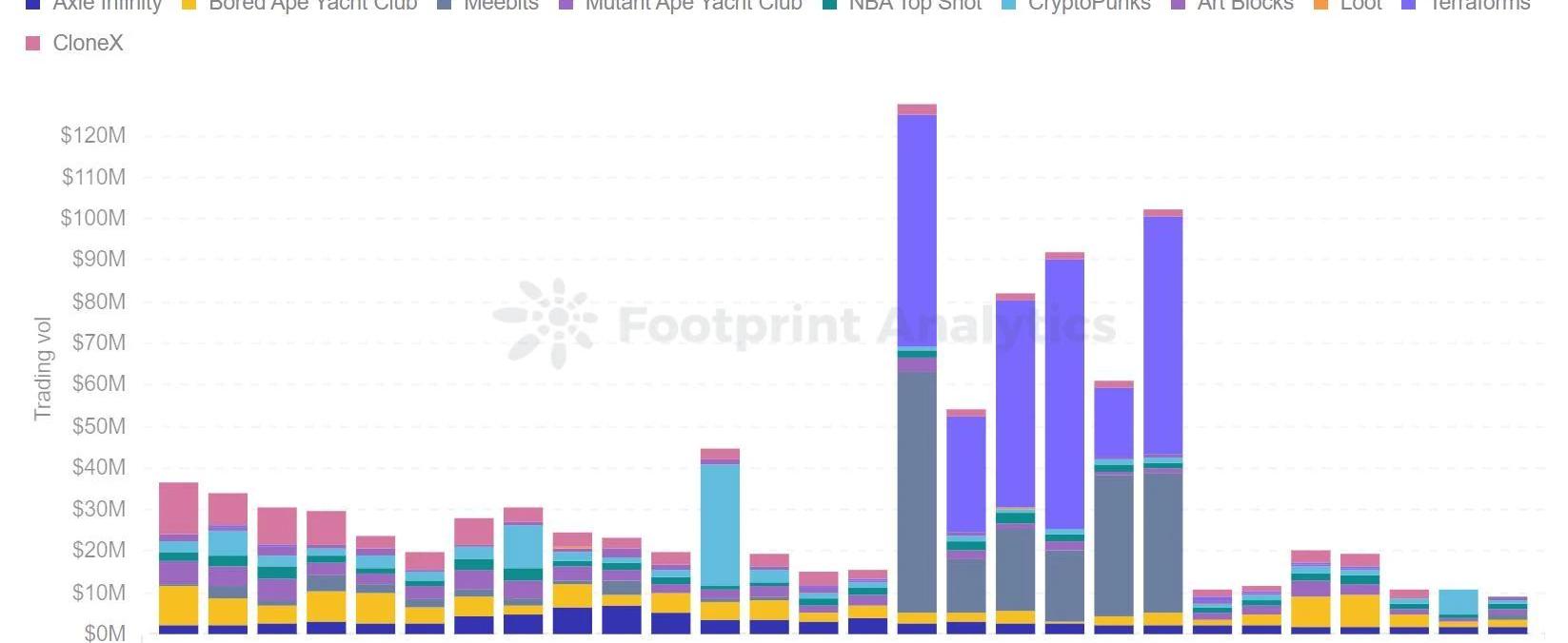 FootprintAnalytics的数据显示,从2月16日到21日期间,项目Terraforms和Meebits的NFT系列交易出现激增,交易量高达5,600万美元。
