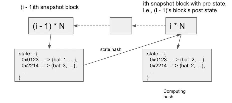 为了启用快速同步,我们有一个周期性的快照区块。一个快照区块包含前状态哈希这一附加信息,即前一个快照区块的后状态哈希: