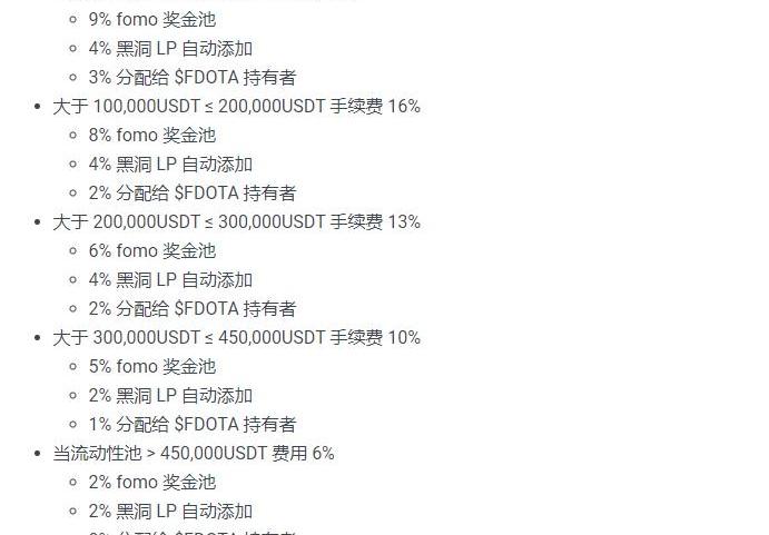 $FDOTA持有者顾名思义是根据持有$FDOTA的数量来获取相应的手续费率,另外一个FOMO奖池也是一个特色,最小触发购买量是2500亿,任何转账的2%-9%会持续添加到Fomo奖金池合约账户中。如果4小时内无人购买代币,Fomo奖金池的50%USDT将奖励给最后一位通证购买者。比如:奖池中有10万USDT,四小时无人购买,那么最后一位通证购买者将获得5万USDT。