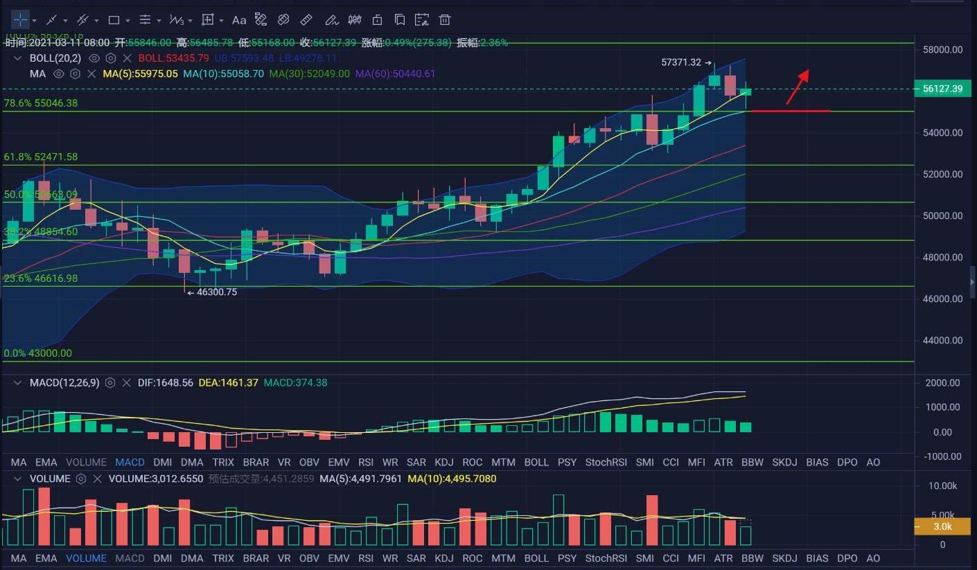 4小时级别上看,4连阳的强势多头格局已经打破,上根K线收阴,目前行情处于回调中,下方支撑在蓝色MA10均线处;易天认为,日内的多头实力强劲,价格虽有回踩,整体还是多头占优,建议顺趋势把握利润,但价格已逼近新高,不建议盲目追涨,稳健还是回踩多单为主,破位之后顺势跟进。上方关注目前高点57371一线阻力位,破位看58000,下方关注55600一线支撑,破位看55000支撑位!