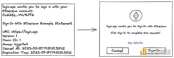 通过商定的签名消息格式,应用程序和钱包现在可以使用相同的语言。 当应用程序向用户提出签名请求时,钱包可以检查该请求,检查它是否适合作为 EIP-4361 消息,并让用户知道他们正在登录网站。