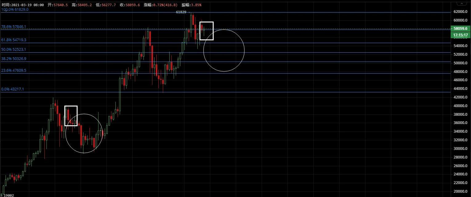 比特币这几天一直在走冲高回落震荡调整行情,昨晚比特币价格再次冲上60000美金关口,57800多单59300止盈睡觉了。早上打开电脑一看盘面,已经打回原形,明显扫盘行情,本来昨晚想好了计划60000反手空,根本不给下单机会。盘面上比特币价格最低跌至56500附近,虽然无间小幅反弹修复了一波,但是感觉诱多的信号越发强烈,毕竟是慢涨,参考上图中的技术面型态,是不是感觉很相似?连续下跌之后,然后接个上影线阳K,然后就是1万点的下跌,这几天比特币也就跌了8000点,看今天的K线型态感觉不乐观了,近期操作上建议高空为主比较好,笔者币市汇金建议57800入场空,看一波54700支撑位,不破的话那么说明就是震荡,离场后反弹再继续做空。买涨我至少要等反弹延续信号出来,或者跌到个人心理价位我才会去布局。