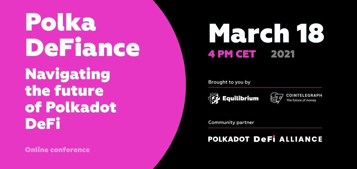 CET时间2021年3月18日16:00,波卡DeFi领域头部项目Equilibrium将联手CoinTelegraph举办线上波卡DeFi峰会PolkaDeFiance。届时,DeFi专家和开发者们将聚集在圆桌环节,交换观点,碰撞想法。