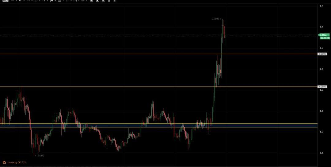 如图所示,波卡在最近两天的行情中表现突出,拉升幅度超50%,主要受事件驱动,一方面受波卡插槽拍卖的影响,另一方面三大所一致开启波卡质押挖矿模式,对市场筹码流通产生较大影响;下方6.8和6附近为短期支撑,中期关注5.1-5.2区间支撑强度。