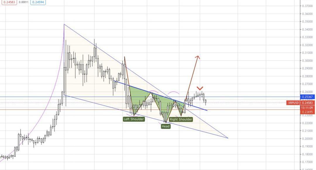 最后,这种情况也发生在XRP身上。在最近的一份报告中指出,由于H&S的形成,XRP将可能冲击0.30美元。但XRP非常意外地拒绝了0.25美元的支撑,并随后向0.24美元回落。