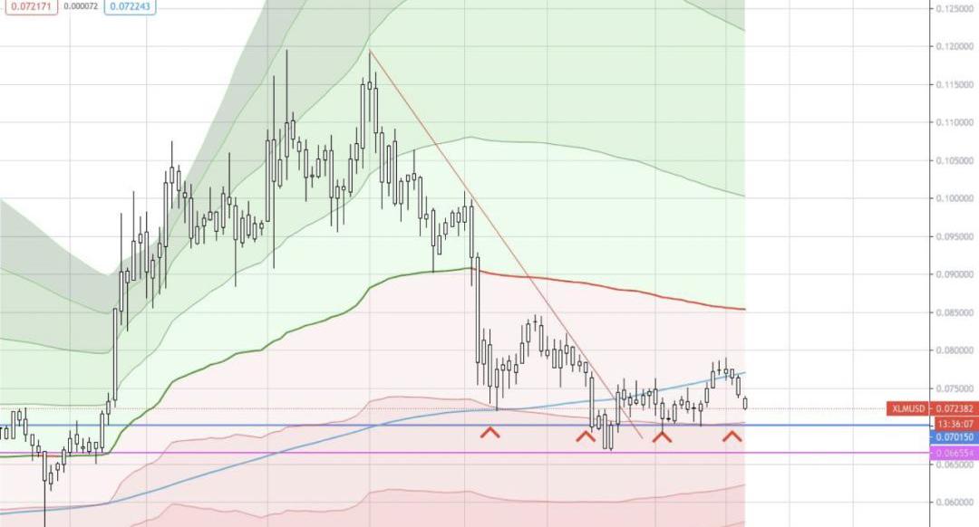 突破这条下降楔形线后,XLM突破了一条非常强的下行阻力线。如下图所示,这条线有许多验证点。