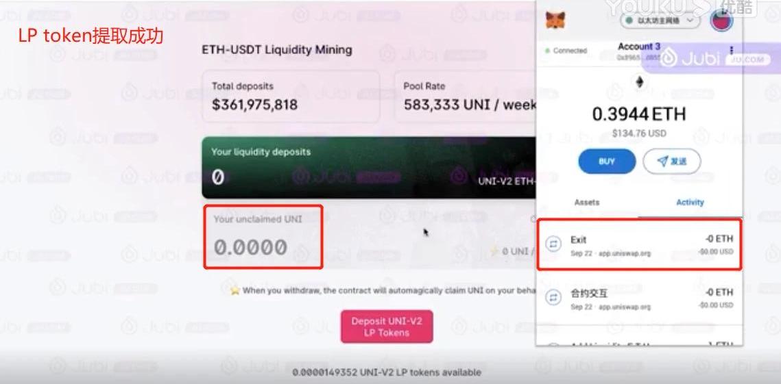 2、挖矿教程:先把ETH注入资金池;再把LPtoken注入UNI挖矿池,选择矿池,调选合约,确认gas费用,等待转账,查看合约交互。