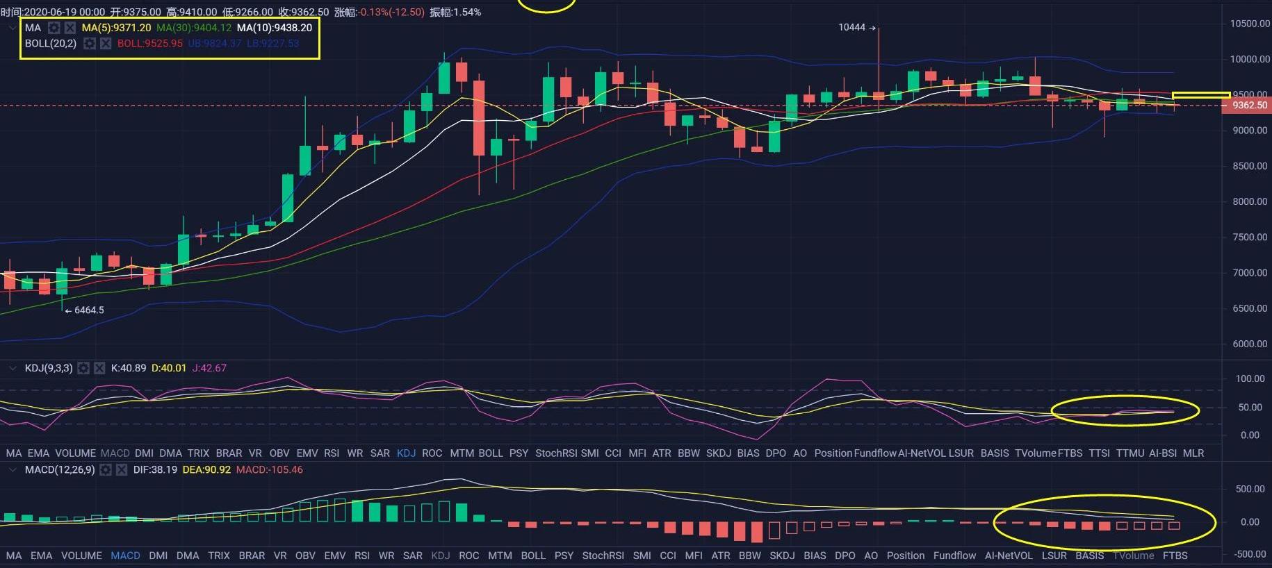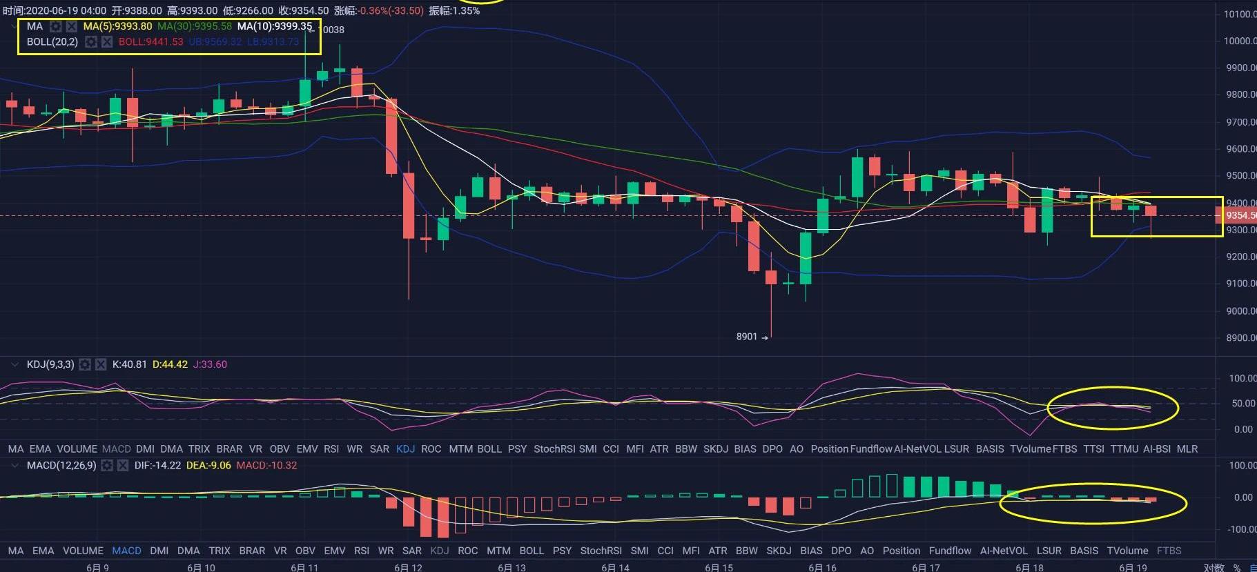 从日线图上来看,昨日收取的是一根带有上下影线的十字星形态,在结合上一根收取的是一根带有长上影的实体阴柱,如果今日K线继续收阴,那么BTC的下跌趋势就稳了;那么接下来我们再看看今日的行情,现在日线BOLL通道依然是平行前进,但是却有开口的趋势,且各均线系统下穿BOLL中轨形成大饼行情的上方压力位;下方KDJ指标三线金叉粘合运行,能量指标MACD快慢线位于零轴上方附近死叉向下粘合运行,空头能量缩量中;综合来分析,易天认为今日日间大饼行情依然会维持区间震荡,但是区间已经有所下行,重点关注上方压力9450-9500区间!