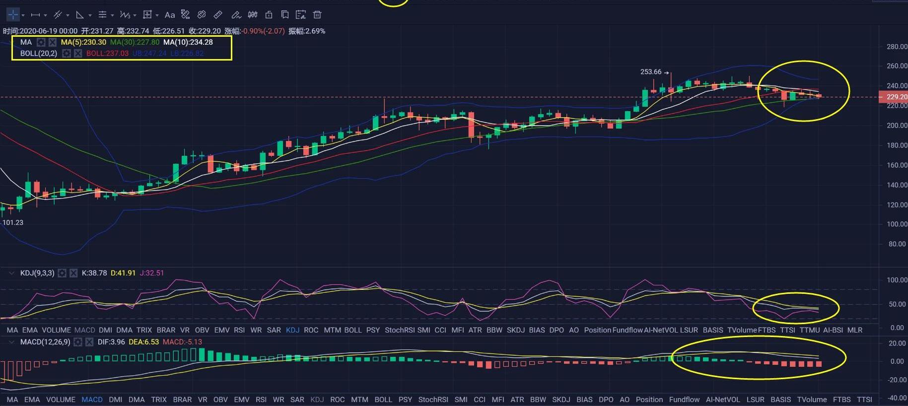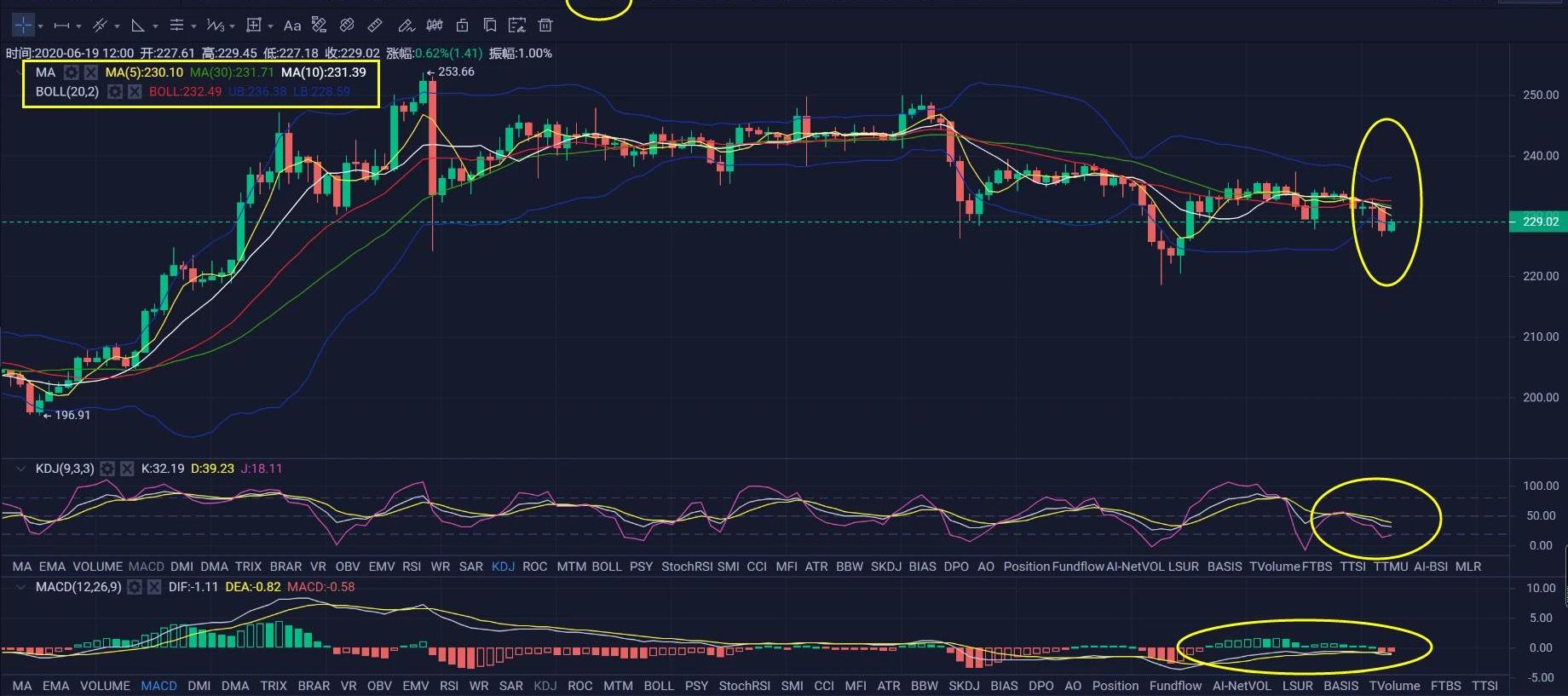再从4小时图来看,BOLL通道向下张口,各均线系统沿着BOLL中轨向下运行,形成目前行情的上方压制,上方ETH的一波下行,已经刺破了下轨支撑,目前行情处于反弹中;下方KDJ指标已经勾头向上有形成金叉的迹象,但是能量指标MACD快慢线却在零轴附近死叉向下运行,空头能量初步释放中;综合来分析,易天认为短周期内ETH行情还是会先来一波反弹,然后触及上方压力后开始下行!