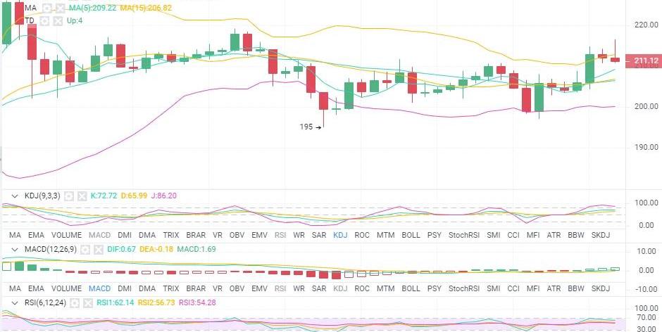 操作建议:209附近多单进场,止盈看215止损206;214附近空单进场,止盈209止损217。