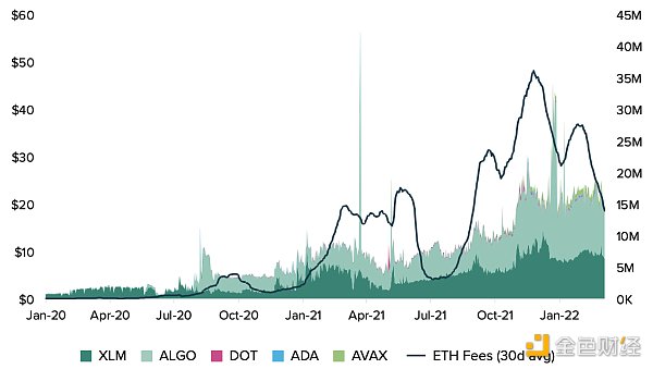 用户活动的涌入迅速导致费用飙升,使得大多数用户在链上进行交易的成本太高,这为 Solana 和 Avalanche 等新兴智能合约平台占领大部分市场创造了机会。随着以太坊费用开始超过每笔交易 10 美元,Stellar、Algorand、Solana 和 Avalanche 等智能合约平台的每日链上交易数量出现强劲增长。截至 2022 年 3 月 15 日,自 2020 年 3 月以来,Solana 已处理超过 120 亿笔交易(根据投票交易进行调整),而以太坊自 2015 年以来的总交易量约为 15 亿笔,在大约四分之一的时间内交易量增加了八倍多。