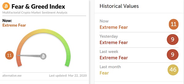 本周,全球加密货币市场大幅反弹上涨,总市值一度站上2000亿美元。本周内比特币最低由4450美元最高涨至6912.43美元,最大涨幅超55%。截止3月22日,恐慌&贪婪指数为11,市场情绪依旧处于极度恐惧状态。整体看来,尽管比特币本周一度逼近7000美元,整体反弹幅度较大,但是仍处于技术性熊市,上方累积的众多套牢盘都将成为市场持续上行的阻力,当前极度恐慌的市场情绪也需要一定时间的化解。在当前极端行情之下,短期市场波动剧烈,市场投机机会也较多,但务必注意做好方向性选择,顺势而为。值得特别强调的是,大幅波动的市场环境之下,需控制好仓位,降低杠杆。