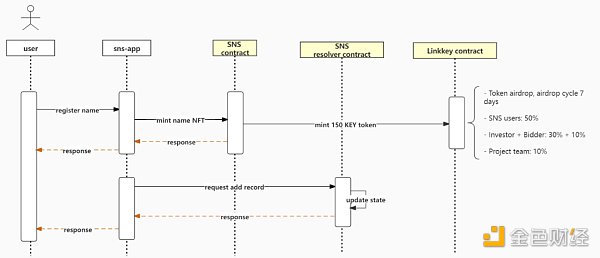 更详细的技术组成如下所示:现有SNS的注册过程以及注册触发的额外代币发行和空投,如图所示: